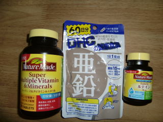 私が今飲んでいるサプリメントの写真です。マルチビタミン、亜鉛、ルテインの組み合わせです。またこの3種類がひとつになったサプリメントもあります。