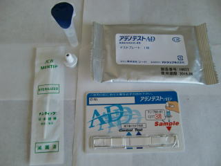 次に、アデノテストという迅速診断キットを用います。点眼麻酔をした後、綿棒で結膜をこすり展開液にうつし、プレートに滴下して約10-15分で結果がでます。陰性の場合はコントロールに赤い線が1本出るだけですが、陽性ではコントロールとテストの部位に2本赤い線が出ます。